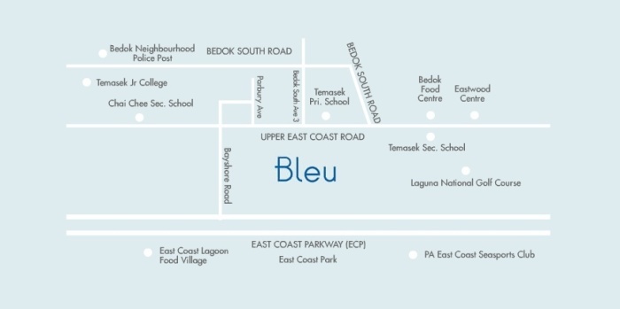 Bleu Bleu @ East Coast is close to New Upper Changi Road Market and Food Centre and Yuan Ming Si Temple. The schools in the vicinity are Temasek Primary School, Temasek Secondary School, Bedok Green Primary School, and St. Anthony's Canossian Primary School. Residents could also get their necessities at the nearby grocery stores, namely NTUC FAIRPRICE, Cold Storage Eastwood, and Giant.